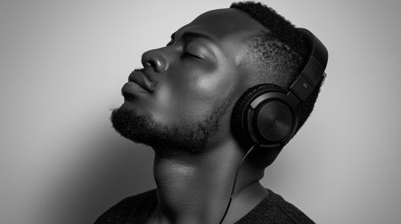 Closeup of an Afroamerican man with headphones, minimalist style, monochrome white and black background, modern and fresh