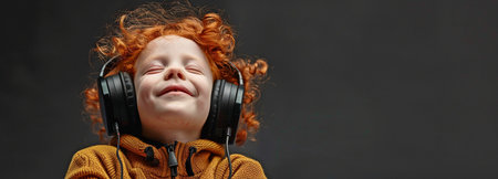 Laughing at the camera in a studio with a black background and copy space is a red-haired boy with Down syndrome wearing headphones.