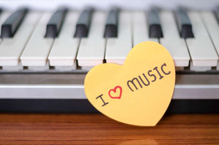 close up to a music lettering word over turntable with red needle and LP vinyl disc. Music lovers