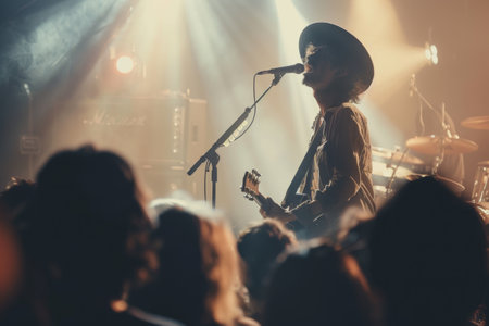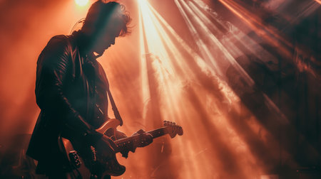 A captivating rock music performance showcasing a silhouetted musician on stage against dramatic lighting, creating an electrifying atmosphere for live entertainment events.