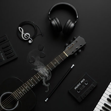 An assortment of black musical instruments and accessories are arranged on a dark surface, creating a stark contrast. The composition includes a guitar, headphones, music notes, a cassette, and piano keys. The lighting appears to be overhead, highlighting the textures and shapes, suitable for various creative and commercial applications.