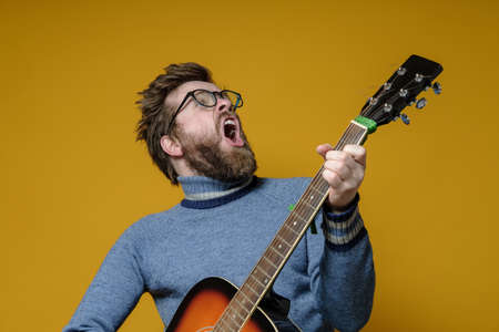 Hipster in an old sweater plays an acoustic guitar and sings loudly, on a yellow background. Hobbies, lifestyle.