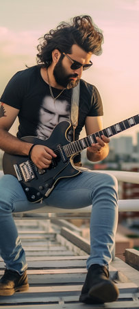 He is never far from his guitar Low angle view of young bearded man holding guitar and looking away while walking outdoors : Generative AI