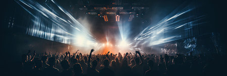Stage lights and crowd of audience with hands raised at a music festival. Fans enjoying the party vibes.