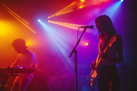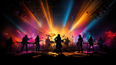 Band performing live music under vibrant stage lights, creating an electrifying atmosphere during an unforgettable concert event