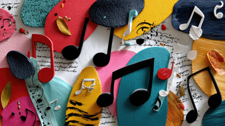 This vibrant abstract composition features colorful shapes and musical notes set against a textured background, celebrating creativity and artistic expression.