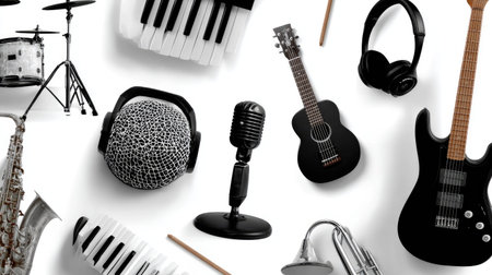 A striking flat lay of various musical instruments showcasing creativity and sound. The arrangement includes guitars, drums, headphones, and a microphone on a clean white background, highlighting the artistry and diversity of music.