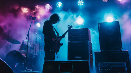 Silhouette of a rock musician playing electric guitar on stage with colorful lights and smoke