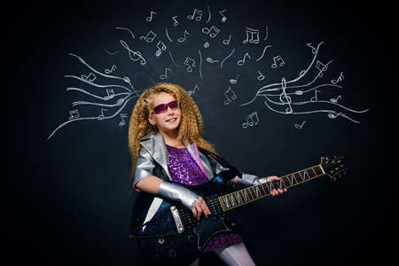 Little rock star singing with her electric guitar over musical background. Music concept.