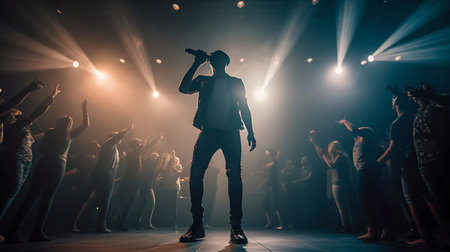 Singer Performing on Concert Stage, Surrounded by Energetic Crowd and Illuminated by Stage Lights. Generative AI. high quality illustration