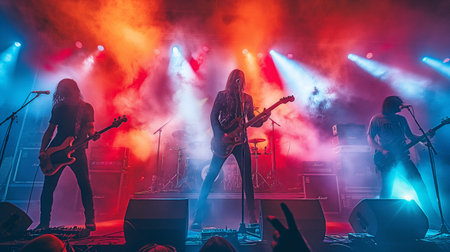 Rock band performing live on stage under dramatic lighting in a vibrant atmosphere