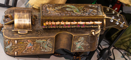 Close-up of an ornate hurdy-gurdy featuring detailed dragon engravings. Antique musical instrument with engraved mythical scenes and vibrant accents.