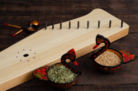 Vintage musical instruments dombra gusli balalaika wooden patterns on the table. horizontal photo