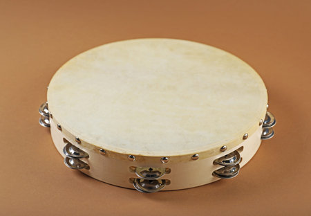 The upper part of the wooden folk noise musical instrument rhythm clapper (rumba, pandeiro) close-up - frame with four pairs of metallic cymbals