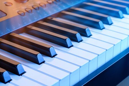 Electronic musical keyboard synthesizer with white and black keys in recording studio. With copy space.