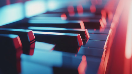 Close-up of piano keys with colorful neon lighting, artistic music instrument concept