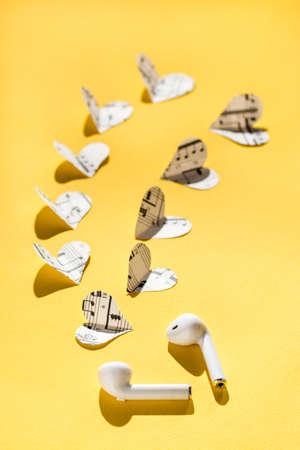 Wireless headphones and hearts cut from the music text on a yellow background. Love to listen to music using gadgets. Vertical view