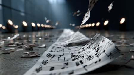 A captivating arrangement of music notes elegantly flowing on sheet paper, set in a modern interior space. Perfect for themes of creativity, harmony, and artistic expression.