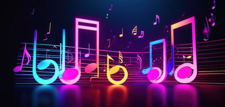 Colorful 3D music notes hover in mid air, casting an enchanting glow in varying shades while celebrating the essence of sound and rhythm.