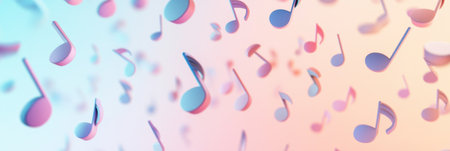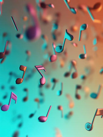 Dynamic 3D music notes cascade against an eye catching gradient background, showcasing a playful blend of colors and forms in digital art.