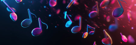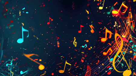 Numerous 3D music notes are suspended in vibrant colors, creating an energetic atmosphere ideal for artistic and musical themes.