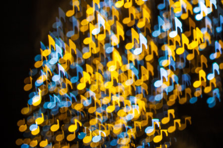 music note shape background bokeh blurred, many objects, colored red yellow orange blue, glow moving, car lights on the road blur, at night. concept background music note.