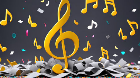 Vibrant musical celebration with golden notes and colorful confetti.