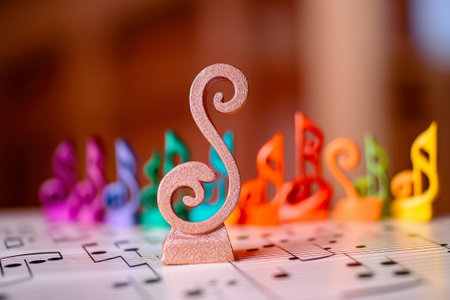 This captivating stock image showcases vibrant music notes gracefully dancing on a white surface. The blurred background enhances this artistic representation, featuring sparkling gems that add a touch of elegance and creativity to the scene. Perfect for conveying themes of music, celebration, and artistic expression.