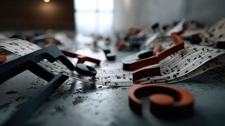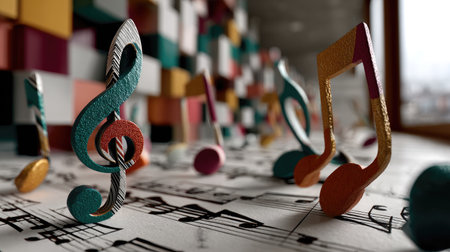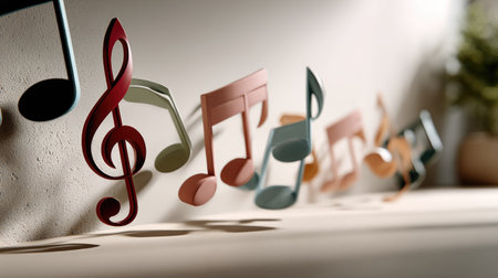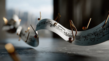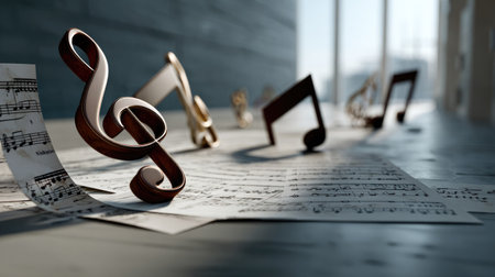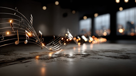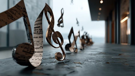 A captivating arrangement of music notes elegantly flowing on sheet paper, set in a modern interior space. Perfect for themes of creativity, harmony, and artistic expression.