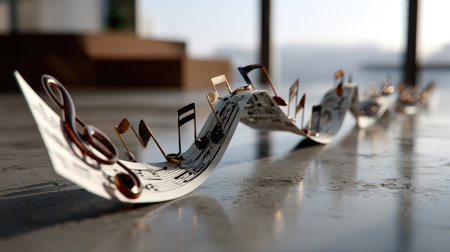 An artistic arrangement of flowing musical notes printed on paper, creating a serene atmosphere in a modern interior space, reflecting creativity and harmony.