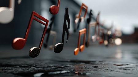 Captivating depiction of floating musical notes in an urban environment, reflecting beautifully on a wet surface, evoking emotions of creativity and inspiration.