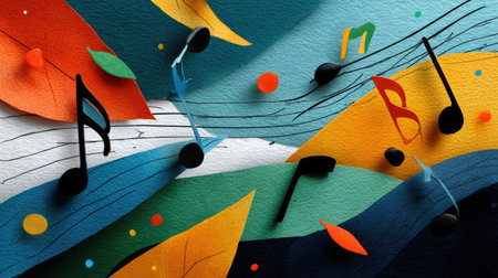 A vibrant arrangement of colorful musical notes and flowing sheet music adds a dynamic touch to any creative project, celebrating the essence of music.
