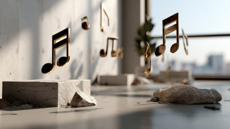 An artistic and modern arrangement of metallic music notes in an elegant interior setting, symbolizing creativity and musical expression in a serene atmosphere.