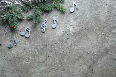 Notes and Christmas decor on gray background