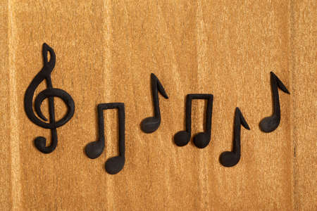 Wooden musical notes on a beige background with copy space