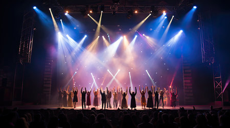 Silhouette of a singer in the spotlight, arms wide open, with stage lights creating a powerful and emotional scene