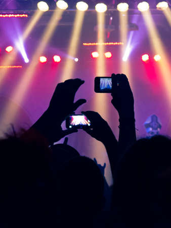 Recording a concert with mobile phone, silhouette of hands with smartphone