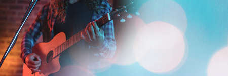 Spots of light with copy space against mid section of male artist playing guitar. music festival and concert concept