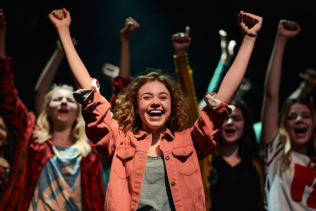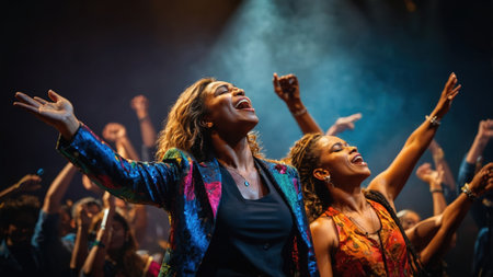 A vibrant group of female singers performing joyfully under colorful stage lights. The image captures the essence of music, culture, and celebration through powerful expressions and unity.