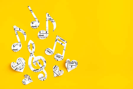 Musical notes, clef and hearts cut from paper with musical text on yellow background. Copy space