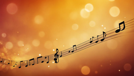 A close-up of a sheet of music with golden music notes and warm lights in the background, symbolizing creativity and harmony.