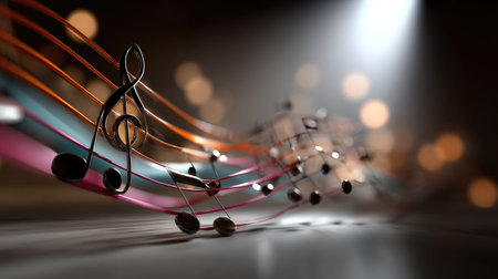 This captivating image features vibrant music notes flowing in colorful waves, illuminated by soft light and creating an artistic atmosphere ideal for conveying emotion.