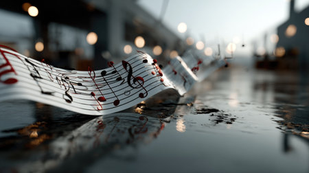 A captivating visual of flowing music notes across a reflective water surface, showcasing serene ambiance with soft lighting and artistic depth. Perfect for creative projects.