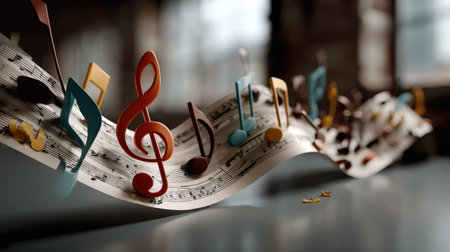 A vibrant arrangement of colorful musical notes and flowing sheet music adds a dynamic touch to any creative project, celebrating the essence of music.