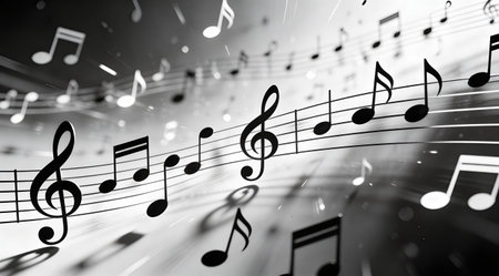 A stunning visual representation of flowing sheet music with musical notes, creating an elegant and serene atmosphere that inspires creativity and emotion.