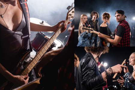 KYIV, UKRAINE - AUGUST 25, 2020: Collage of musicians looking at camera, drummer holding drumstick, woman playing electric guitar near drum kit