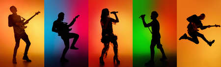 Silhouettes of various musicians playing different instruments over multicolored background in neon.