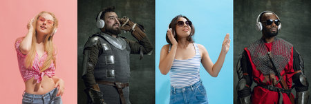 Eras comparison. Different people, modern youth and medieval persons in vintage clothing on dark background. Collage. Art, fashion, beauty