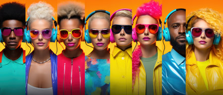 Neon Portraits, Emotional People Faces Collage, Young People Listen to Music with Headphones, Generative AI Illustration
