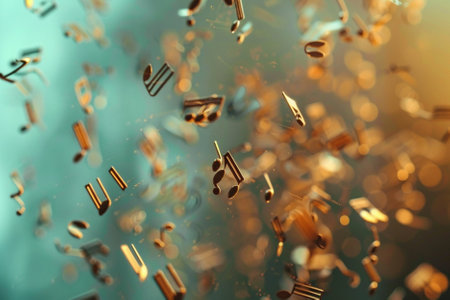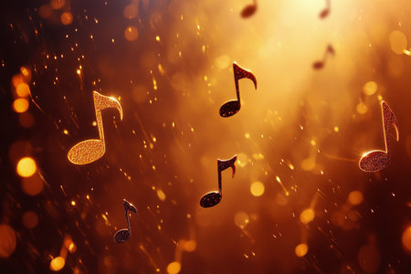 Vibrant golden notes drift among shimmering sparkles and glowing light flares, creating a lively and elegant musical atmosphere.